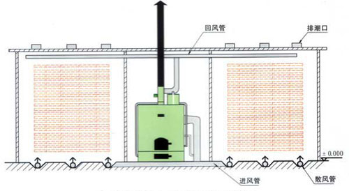 热风式烘干设备工作原理是利用燃烧产生的热能,加热窑内的空气,由热风炉顶部主风机将窑内的空气通过管道吸入炉体,将空气加热。再通过管道,送入窑内,由窑内的循环风机不断的循环对窑内的木材均匀加热。木材烘干过程中如需要蒸汽,可由热风炉内的蒸汽发生器提供,如果是一炉两房时,管道上装有插阀,通过插阀的调节来控制窑内的温度。在烘干的过程中,由于木材要进行排湿,在窑顶上留有排湿孔。